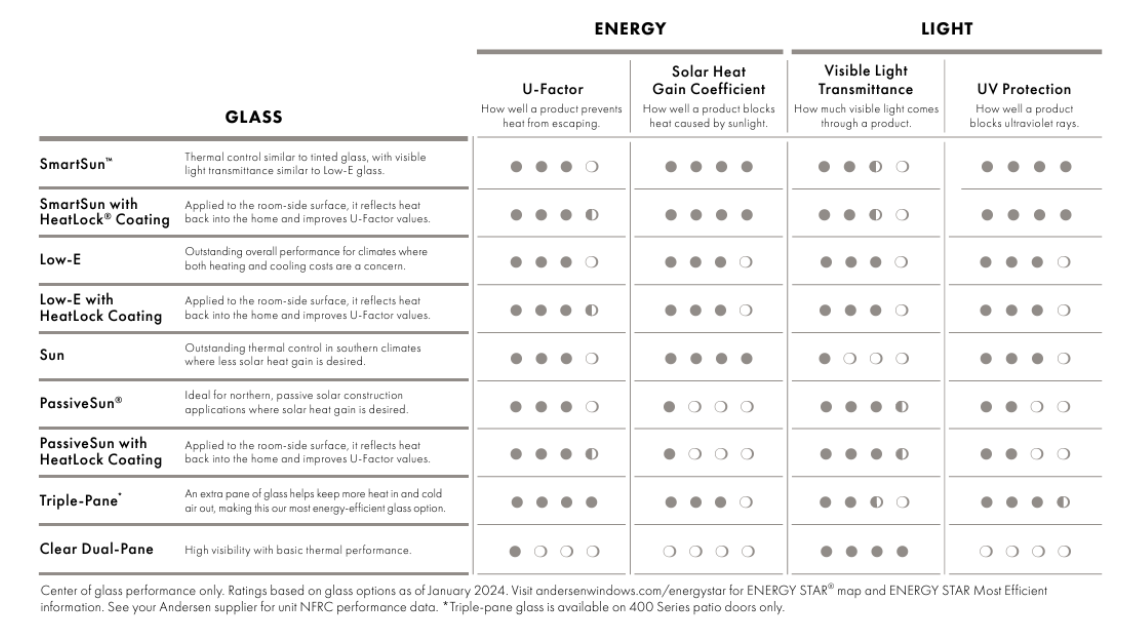 Saving energy is a key focus for today's homeowners. The Andersen 400 Series is crafted with energy-efficient features to maintain year-round comfort in your home. The Low-E glass helps by reflecting heat away in summer and trapping it during winter. It also reduces UV rays and lowers energy costs.